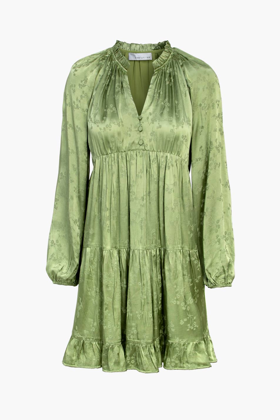 Jacquard print mini dress featuring long sleeves with elasticated cuffs and a tiered skirt.