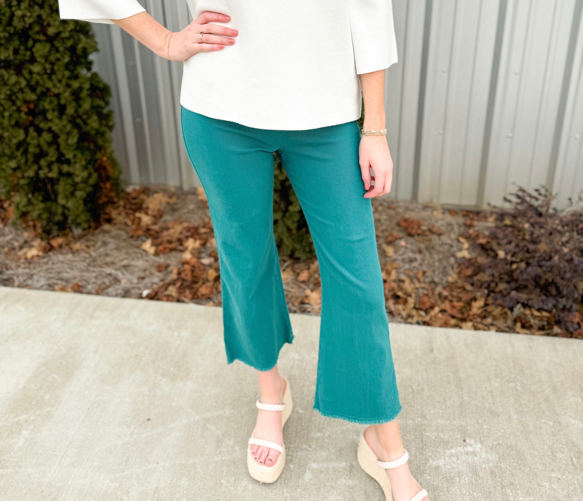 Soft washed pants with very comfortable stretchy fabric. Made from an adaptable fabric featuring high-rise, button closure at front, wide leg that hits above the ankle. Cut edge detail makes your look special.